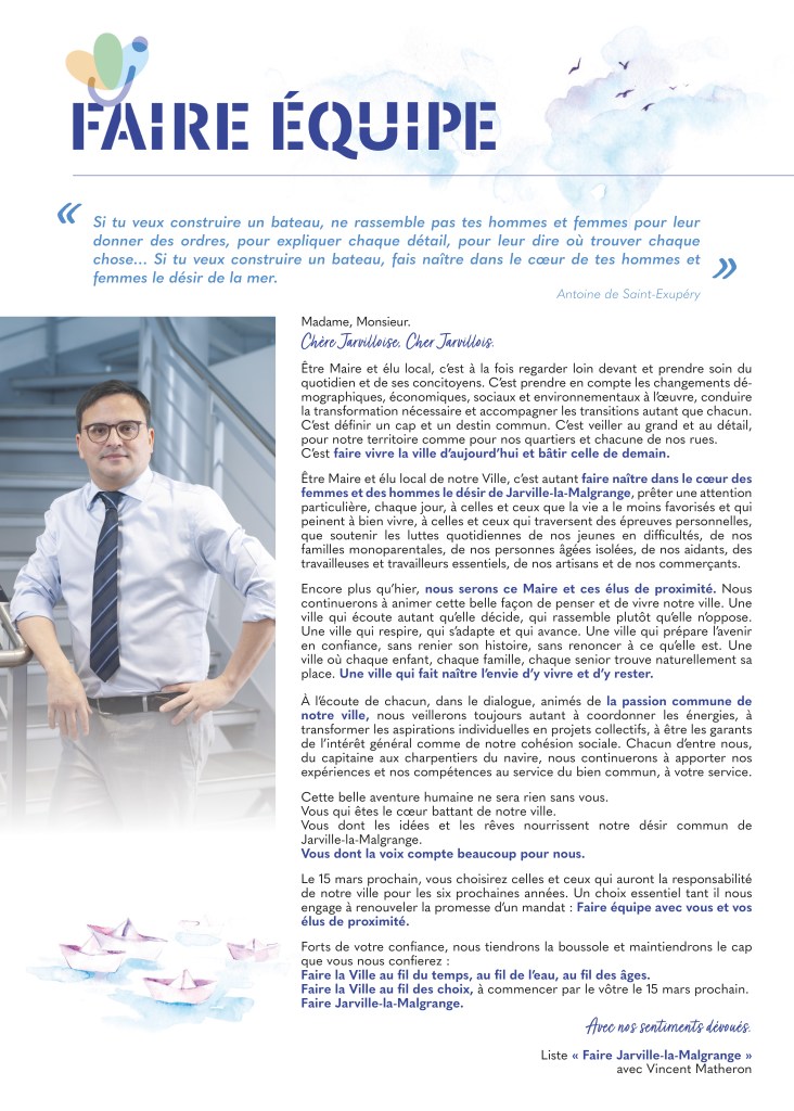 L’élection municipale et la campagne qui la précède sont l’occasion de maîtriser le destin des transitions en cours. De continuer à écrire ensemble le récit de la transformation de notre ville. D’affirmer notre volonté commune d’inventer la ville de demain. De sourire à l’avenir. De remonter le fil de l’histoire pour ancrer « le fil de faire ».